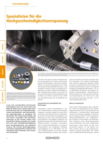 TECHNOLOGIEFR%u00c4SEN BOHREN DREHEN STECHEN INDUSTRIENSpezialisten f%u00fcr die HochgeschwindigkeitszerspanungDank additiver Fertigung besitzt der neue GCPAD-Adapter einen integrierten D%u00e4mpfungsmechanismus, der Sto%u00dfbelastungen reduziert und das Risiko von Plattenbr%u00fcchen minimiert.In der Luft- und Raumfahrt sind KeramikSchneidstoffe schon seit vielen Jahren das Mittel der Wahl, wenn es darum geht, sicherheitsrelevante Teile wie Triebwerkskomponenten aus Nickelbasis- oder hochwarmfesten Superlegierungen zu Schruppen. Die Werkstoffe sind temperaturbest%u00e4ndig, z%u00e4h und schwer zerspanbar. Wo Hartmetallwerkzeuge an ihre Grenzen sto%u00dfen, kann Keramik ihre St%u00e4rken ausspielen. Sie erm%u00f6glicht sehr hohe Schnittgeschwindigkeiten, kurze Bearbeitungszeiten und produktive Prozesse. Mit cleveren Werkzeugl%u00f6sungen, innovativen Schneidstoffen und Know-how unterst%u00fctzt ISCAR Anwender beim Zerspanen mit Keramik.%u201eKeramik h%u00e4lt deutlich h%u00f6here Temperaturen aus als Hartmetall, sie ist h%u00e4rter und chemisch wesentlich best%u00e4ndiger%u201c, fasst Antonia Splettst%u00f6%u00dfer vom Business Development bei ISCAR die Vorteile des Schneidstoffs zusammen. %u201eDas erm%u00f6glicht deutlich h%u00f6here Schnittgeschwindigkeiten und damit Produktivit%u00e4tssteigerungen.%u201c W%u00e4hrend beim Drehen von Inconel 718 mit einer beschichteten Hartmetallplatte etwa 50 Meter pro Minute realistisch sind, schafft eine Keramikschneide mehr als 300 Meter pro Minute.Innovationen bei Schneidstoff und WerkzeugenUrspr%u00fcnglich wurden Keramikplatten in der Luft- und Raumfahrt vor allem zum Schruppen eingesetzt, inzwischen wagen sich immer mehr Anwender in der Branche auch ans Schlichten.Der Grund: Die Keramiken, Schneidplatten und Werkzeuge wurden stetig weiterentwickelt, Bruchsicherheit und Z%u00e4higkeit verbessert. Die Bandbreite keramischer Schneidstoffe ist gro%u00df.Whisker-verst%u00e4rkte Keramiken kombinieren hohe Temperaturbest%u00e4ndigkeit mit gr%u00f6%u00dferer Bruchsicherheit und erm%u00f6glichen Schnittgeschwindigkeiten bis zu 300 Metern pro Minute. SiAlON-Keramiken sind etwas weniger temperaturbest%u00e4ndig, erlauben aber deutlich h%u00f6here Vorsch%u00fcbe und eignen sich daher ideal f%u00fcrs Schruppen. Eine weitere Entwicklungsstufe sind die sogenannten Bidemics, ISCARs innovativer Schneidstoff, der die Vorteile von Keramik und Hartmetall vereint. Er erm%u00f6glicht Hochgeschwindigkeitsbearbeitungen mit bis zu 400 Metern pro Minute, bei zugleich verbesserter Prozessstabilit%u00e4t. %u201eISCAR bietet ein breites Portfolio mit mehr als 400 verschiedenen Keramikplatten. Da findet sich f%u00fcr jede Anwendung die passende Schneide%u201c, ist sich Antonia Splettst%u00f6%u00dfer sicher.H%u00f6here Produktivit%u00e4tAuch auf der Werkzeugseite gibt es Neuheiten. ISCAR hat beispielsweise einen GCPADAdapter entwickelt, der f%u00fcr das Einstechen und Stechdrehen in hochwarmfeste Legierungen und Guss mit Keramik ausgelegt ist. Dank additiver Fertigung besitzt er einen integrierten D%u00e4mpfungsmechanismus, der Sto%u00dfbelastungen reduziert und das Risiko von Plattenbr%u00fcchen minimiert, sowie str%u00f6mungsoptimierte interne K%u00fchlkan%u00e4le und exakt ausgerichtete KSS-Austritte. %u201eDamit lenken wir den K%u00fchlschmierstoff dorthin, wo die W%u00e4rme entsteht, n%u00e4mlich genau in die Zerspanzone%u201c, erl%u00e4utert Antonia Splettst%u00f6%u00dfer. Mit ISCARs neuen CERMTURN-Drehwerkzeugen k%u00f6nnen ISCAR bietet eine breite Palette an Schneidplatten in verschiedenen Formen auf Siliziumnitrid- und AluminiumoxidBasis, whiskerverst%u00e4rkte Keramiken und die neu entwickelten Bidemics. Rund 400 verschiedene Keramik-Schneiden findensich im Portfolio.40