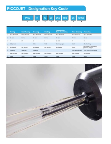 Turning Back Turning Grooving ProfilingChamfering / Back Chamfering Face Grooving Threading1 PICJ - PICCOJET PICJ - PICCOJET PICJ - PICCOJET PICJ - PICCOJET PICJ - PICCOJET PICJ - PICCOJET PICJ - PICCOJET2 RH / LH RH / LH RH / LH RH / LH RH / LH RH / LH RH / LH3 T BT G P CH / BC F TH4 Cutting Angle Width Width Chamfering angle Width Max. Overhang5 Min. Diameter Min. Diameter Min. Diameter Min. Diameter Min. Diameter DAXN I -ISO/UN (60%u00b0) / W-Whitworth (BSW, BSF, BSP) (55%u00b0)6 Radius size Radius size Radius size CDX Machining depth TPN - Pitch minimum/nominal7 Max. Overhang Max. Overhang Max. Overhang Max. Overhang Max. Overhang Max. Overhang Min. Diameter8 Grade Grade Grade Grade Grade Grade GradePICCOJET - Designation Key CodePICJ R G 20 D60 R15 25 IC9081 2 3 4 5 6 7 8