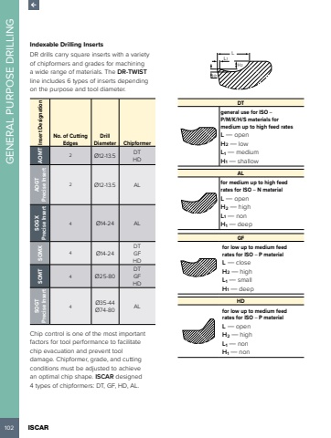 102 ISCAR GENERAL PURPOSE DRILLING Indexable Drilling InsertsDR drills carry square inserts with a variety of chipformers and grades for machining a wide range of materials. The DR-TWISTline includes 6 types of inserts depending on the purpose and tool diameter. Insert DesignationNo. of Cutting EdgesDrill Diameter ChipformerAOMT 2 %u00d812-13.5 DTHDAOGT Precise Insert 2 %u00d812-13.5 ALSOGXPrecise Insert 4 %u00d814-24 AL SOMX 4 %u00d814-24DTGFHDSOMT 4 %u00d825-80DTGFHDSOGT Precise Insert 4 %u00d835-44 %u00d874-80 ALChip control is one of the most important factors for tool performance to facilitate chip evacuation and prevent tool damage. Chipformer, grade, and cutting conditions must be adjusted to achieve an optimal chip shape. ISCAR designed 4 types of chipformers: DT, GF, HD, AL.LL1H2H1DTgeneral use for ISO %u2013 P/M/K/H/S materials for medium up to high feed rates L %u2014 open H2 %u2014 low L1 %u2014 medium H1 %u2014 shallowALfor medium up to high feed rates for ISO %u2013 N material L %u2014 open H2 %u2014 high L1 %u2014 non H1 %u2014 deepGFfor low up to medium feed rates for ISO %u2013 P material L %u2014 close H2 %u2014 high L1 %u2014 small H1 %u2014 deepHDfor low up to medium feed rates for ISO %u2013 P material L %u2014 open H2 %u2014 high L1 %u2014 non H1 %u2014 non