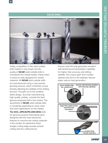 139GENERAL PURPOSE DRILLINGSOLID-DRILLToday, competition in the solid carbide drills market is very tough, but the quality of ISCAR solid carbide drills is considered the market leader, mainly when it comes to drills designed for certain materials. All ISCAR solid carbide drills are manufactured using a very precise grinding process, which minimizes runout, thereby affecting the stability of the drilling process. Thought out to the smallest detail design, accurate manufacturing, high quality coating - provide the best general proposed drill in the market. The assortment of ISCAR solid carbide drills is constantly expanding to cover more and more applications on the market.The SCD%u2026APN/ACPN (3XD-8XD) drills for general purpose holemaking were designed with the most advanced features to machine the variety materials in the market. An optimized sharp straight cutting edge provide smooth cutting and low cutting forces.Precise web thinning generates excellent self-centering and penetration capability for higher hole accuracy and drilling stability. The unique gash form creates optimal chip form in all materials. Narrow wiper reduce heat generation. sharp straight edgelow cutting forceprecise web thinning excellent self-centering capabilitylarger flute gullet sectionimproved chip evacuationexisting flutepolished flutesmooth chip flow