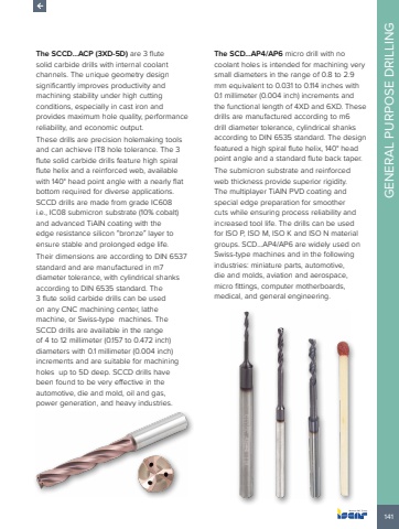 141GENERAL PURPOSE DRILLINGThe SCCD%u2026ACP (3XD-5D) are 3 flute solid carbide drills with internal coolant channels. The unique geometry design significantly improves productivity and machining stability under high cutting conditions, especially in cast iron and provides maximum hole quality, performance reliability, and economic output. These drills are precision holemaking tools and can achieve IT8 hole tolerance. The 3 flute solid carbide drills feature high spiral flute helix and a reinforced web, available with 140%u00b0 head point angle with a nearly flat bottom required for diverse applications. SCCD drills are made from grade IC608 i.e., IC08 submicron substrate (10% cobalt) and advanced TiAlN coating with the edge resistance silicon %u201cbronze%u201d layer to ensure stable and prolonged edge life. Their dimensions are according to DIN 6537 standard and are manufactured in m7 diameter tolerance, with cylindrical shanks according to DIN 6535 standard. The 3 flute solid carbide drills can be used on any CNC machining center, lathe machine, or Swiss-type machines. The SCCD drills are available in the range of 4 to 12 millimeter (0.157 to 0.472 inch) diameters with 0.1 millimeter (0.004 inch) increments and are suitable for machining holes up to 5D deep. SCCD drills have been found to be very effective in the automotive, die and mold, oil and gas, power generation, and heavy industries.The SCD%u2026AP4/AP6 micro drill with no coolant holes is intended for machining very small diameters in the range of 0.8 to 2.9 mm equivalent to 0.031 to 0.114 inches with 0.1 millimeter (0.004 inch) increments and the functional length of 4XD and 6XD. These drills are manufactured according to m6 drill diameter tolerance, cylindrical shanks according to DIN 6535 standard. The design featured a high spiral flute helix, 140%u00b0 head point angle and a standard flute back taper. The submicron substrate and reinforced web thickness provide superior rigidity. The multiplayer TiAlN PVD coating and special edge preparation for smoother cuts while ensuring process reliability and increased tool life. The drills can be used for ISO P, ISO M, ISO K and ISO N material groups. SCD%u2026AP4/AP6 are widely used on Swiss-type machines and in the following industries: miniature parts, automotive, die and molds, aviation and aerospace, micro fittings, computer motherboards, medical, and general engineering.