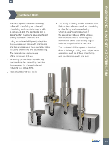 155PRE-THREAD DRILLING WITH CHAMFERING %u00bd%u0009Combined DrillsThe most optimal solution for drilling holes with chamfering, or holes with chamfering and counterboring, is with a combined drill. The combined drill is designed for machining several different drilling operations with one drill. Using a combined drill greatly simplifies the processing of holes with chamfering and the processing of more complex holes, including chamfering and counterboring. The most obvious advantages of the combined drill are:%u2022 Increasing productivity - by reducing machine time, i.e., cancelling machine time required to change tools and reducing tool set-up time.%u2022 Reducing required tool stock.%u2022 The ability of drilling a more accurate hole that contains elements such as chamfering or chamfering and counterboring, which is a significant reduction in the coaxial deviations of the various hole elements due to removing axis movements of the table during regular tools exchange inside the machine.The combined drill is a great option that does not change cutting tools but performs operations such as drilling, chamfering, and counterboring with one tool.