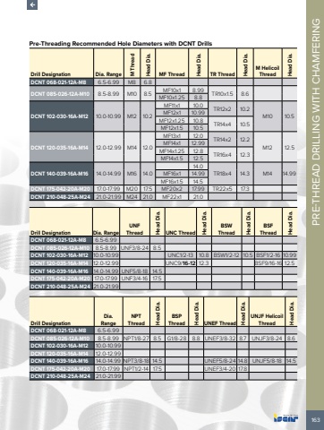 163PRE-THREAD DRILLING WITH CHAMFERING Pre-Threading Recommended Hole Diameters with DCNT DrillsDrill Designation Dia. Range M ThreadHead Dia.MF Thread Head Dia.TR Thread Head Dia.M Helicoil Thread Head Dia.DCNT 068-021-12A-M8 6.5-6.99 M8 6.8DCNT 085-026-12A-M10 8.5-8.99 M10 8.5 MF10x1 8.99 TR10x1.5 8.6 MF10x1.25 8.8DCNT 102-030-16A-M12 10.0-10.99 M12 10.2MF11x1 10.0 TR12x2 10.2M10 10.5 MF12x1 10.99MF12x1.25 10.8 TR14x4 10.5 MF12x1.5 10.5DCNT 120-035-16A-M14 12.0-12.99 M14 12.0MF13x1 12.0 TR14x2 12.2M12 12.5 MF14x1 12.99MF14x1.25 12.8 TR16x4 12.3 MF14x1.5 12.5DCNT 140-039-16A-M16 14.0-14.99 M16 14.014.0MF16x1 14.99 TR18x4 14.3 M14 14.99MF16x1.5 14.5DCNT 175-042-20A-M20 17.0-17.99 M20 17.5 MF20x2 17.99 TR22x5 17.3DCNT 210-048-25A-M24 21.0-21.99 M24 21.0 MF22x1 21.0Drill Designation Dia. RangeUNF Thread Head Dia.UNC Thread Head Dia.BSW Thread Head Dia.BSF Thread Head Dia.DCNT 068-021-12A-M8 6.5-6.99DCNT 085-026-12A-M10 8.5-8.99 UNF3/8-24 8.5DCNT 102-030-16A-M12 10.0-10.99 UNC1/2-13 10.8 BSW1/2-12 10.5 BSF1/2-16 10.99DCNT 120-035-16A-M14 12.0-12.99 UNC9/16-12 12.3 BSF9/16-16 12.5DCNT 140-039-16A-M16 14.0-14.99 UNF5/8-18 14.5DCNT 175-042-20A-M20 17.0-17.99 UNF3/4-16 17.5DCNT 210-048-25A-M24 21.0-21.99Drill DesignationDia. RangeNPT Thread Head Dia.BSP Thread Head Dia.UNEF Thread Head Dia.UNJF Helicoil Thread Head Dia.DCNT 068-021-12A-M8 6.5-6.99DCNT 085-026-12A-M10 8.5-8.99 NPT1/8-27 8.5 G1/8-28 8.8 UNEF3/8-32 8.7 UNJF3/8-24 8.6DCNT 102-030-16A-M12 10.0-10.99DCNT 120-035-16A-M14 12.0-12.99DCNT 140-039-16A-M16 14.0-14.99 NPT3/8-18 14.5 UNEF5/8-24 14.8 UNJF5/8-18 14.5DCNT 175-042-20A-M20 17.0-17.99 NPT1/2-14 17.5 UNEF3/4-20 17.8DCNT 210-048-25A-M24 21.0-21.99