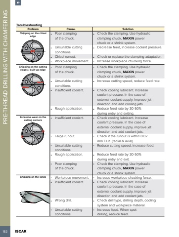 182 ISCAR PRE-THREAD DRILLING WITH CHAMFERING TroubleshootingProblem Cause. Solution.Chipping on the chisel edge %u2022 Poor clamping of the chuck.%u2022 Check the clamping. Use hydraulic clamping chuck, MAXIN power chuck or a shrink system.%u2022 Unsuitable cutting conditions.%u2022 Decrease feed, increase coolant pressure.%u2022 Chisel runout. %u2022 Check or replace the clamping adaptation.%u2022 Workpiece movement. %u2022 Increase workpiece chucking force.Chipping on the cutting edges / built-up edge %u2022 Poor clamping of the chuck.%u2022 Check the clamping. Use hydraulic clamping chuck, MAXIN power chuck or a shrink system.%u2022 Unsuitable cutting conditions.%u2022 Increase cutting speed, reduce feed rate.%u2022 Insufficient coolant. %u2022 Check cooling lubricant. Increase coolant pressure. In the case of external coolant supply, improve jet direction and add cooling jets.%u2022 Rough application. %u2022 Reduce feed rate by 30-50% during entry and exiting.Excessive wear on the cutting corners %u2022 Insufficient coolant. %u2022 Check cooling lubricant. Increase coolant pressure. In the case of external coolant supply, improve jet direction and add coolant jets.%u2022 Large runout. %u2022 Check if the runout is within 0.02 mm T.I.R. (radial & axial).%u2022 Unsuitable cutting conditions.%u2022 Reduce cutting speed, increase feed.%u2022 Rough application. %u2022 Reduce feed rate by 30-50% during entry and exit.%u2022 Poor clamping of the chuck.%u2022 Check the clamping. Use hydraulic clamping chuck, MAXIN power chuck or a shrink system.Chipping on the lands %u2022 Workpiece movement. %u2022 Increase workpiece chucking force.%u2022 Insufficient coolant. %u2022 Check cooling lubricant. Increase coolant pressure. In the case of external coolant supply, improve jet direction and add coolant jets.%u2022 Wrong drill. %u2022 Check drill type, drilling depth, cooling system and workpiece material.%u2022 Unsuitable cutting conditions.%u2022 Increase feed. When spot drilling, reduce feed.