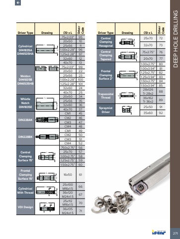 271DEEP HOLE DRILLING Driver Type Drawing %u00d8D x L Driver Code Cylindrical DIN1835A DIN6535HALD.75x2.03%u201d 9520x50 1025x56 111.00x2.28%u201d 961.25x2.28%u201d 9732x60 1240x70 13Weldon DIN1835B DIN6535HBLDLD.75x2.03%u201d 9920x50 2225x56 231.00x2.28%u201d 1001.25x2.28%u201d 10132x60 2440x70 25Whistle Notch DIN1835ELD20x50 3425x56 3532x60 3640x70 37DIN228AKCM1 45CM2 46CM3 47CM4 48DIN228BKCM1 49CM2 50CM3 51CM4 52Central Clamping Surface 15%u00b0LD.750x2.75%u201d 5625x70 571.00x2.75%u201d 581.25x2.75%u201d 591.50x2.75%u201d 60Frontal Clamping Surface 15%u00b0LD16x50 61Cylindrical With ThreadL MD25x100 M16x1.5 6636x120 M24x1.5 67VDI DesignLD M25x112 M16x1.5 7036x135 M24x1.5 71Driver Type Drawing %u00d8D x L Driver Code Central Clamping HexagonalLD25x70 7232x70 73Central Clamping TaperedL .75x2.75%u201d 7620x70 77 Frontal Clamping Surface 2%u00b0LD1.00x2.75%u201d 80 1.00x3.94%u201d 81 1.25x2.75%u201d 82 1.25x3.94%u201d 83 1.50x2.75%u201d 84 1.50x3.94%u201d 85 Trapezoidal ThreadLTr D28x126 Tr 28x2 88 36x162 Tr 36x2 89 Spraymist DriverLD25x50 91 35x60 92