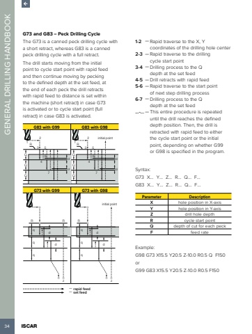 34 ISCAR GENERAL DRILLING HANDBOOKG73 and G83 %u2013 Peck Drilling Cycle The G73 is a canned peck drilling cycle with a short retract, whereas G83 is a canned peck drilling cycle with a full retract.The drill starts moving from the initial point to cycle start point with rapid feed and then continue moving by pecking to the defined depth at the set feed, at the end of each peck the drill retracts with rapid feed to distance is set within the machine (short retract) in case G73 is activated or to cycle start point (full retract) in case G83 is activated.G83 with G99 G83 with G981 R2346dQd75QQ1 R2 initial point346dQd75QQG73 with G99 G73 with G98R Rd qqqzdRinitial pointd qqqzd%u2014 rapid feed %u2014 set feed1-2 %u2014Rapid traverse to the X, Y coordinates of the drilling hole center2-3 %u2014Rapid traverse to the drilling cycle start point3-4 %u2014Drilling process to the Q depth at the set feed4-5 %u2014Drill retracts with rapid feed5-6 %u2014Rapid traverse to the start point of next step drilling process6-7 %u2014Drilling process to the Q depth at the set feed...-...%u2014This entire procedure is repeated until the drill reaches the defined depth position. Then, the drill is retracted with rapid feed to either the cycle start point or the initial point, depending on whether G99 or G98 is specified in the program.Syntax: G73 X%u2026 Y%u2026 Z%u2026 R%u2026 Q%u2026 F%u2026G83 X%u2026 Y%u2026 Z%u2026 R%u2026 Q%u2026 F%u2026Parameter DescriptionX hole position in X-axisY hole position in Y-axisZ drill hole depthR cycle start pointQ depth of cut for each peckF feed rateExample:G98 G73 X15.5 Y20.5 Z-10.0 R0.5 Q F150orG99 G83 X15.5 Y20.5 Z-10.0 R0.5 F150
