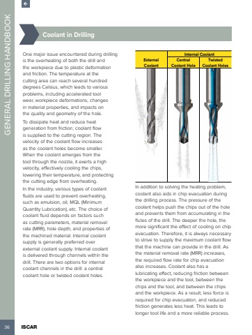 36 ISCAR GENERAL DRILLING HANDBOOK %u00bd%u0009Coolant in DrillingOne major issue encountered during drilling is the overheating of both the drill and the workpiece due to plastic deformation and friction. The temperature at the cutting area can reach several hundred degrees Celsius, which leads to various problems, including accelerated tool wear, workpiece deformations, changes in material properties, and impacts on the quality and geometry of the hole.To dissipate heat and reduce heat generation from friction, coolant flow is supplied to the cutting region. The velocity of the coolant flow increases as the coolant holes become smaller. When the coolant emerges from the tool through the nozzle, it exerts a high velocity, effectively cooling the chips, lowering their temperature, and protecting the cutting edge from overheating.In the industry, various types of coolant fluids are used to prevent overheating, such as emulsion, oil, MQL (Minimum Quantity Lubrication), etc. The choice of coolant fluid depends on factors such as cutting parameters, material removal rate (MRR), hole depth, and properties of the machined material. Internal coolant supply is generally preferred over external coolant supply. Internal coolant is delivered through channels within the drill. There are two options for internal coolant channels in the drill: a central coolant hole or twisted coolant holes.External CoolantInternal CoolantCentral Coolant HoleTwisted Coolant HolesIn addition to solving the heating problem, coolant also aids in chip evacuation during the drilling process. The pressure of the coolant helps push the chips out of the hole and prevents them from accumulating in the flutes of the drill. The deeper the hole, the more significant the effect of cooling on chip evacuation. Therefore, it is always necessary to strive to supply the maximum coolant flow that the machine can provide in the drill. As the material removal rate (MRR) increases, the required flow rate for chip evacuation also increases. Coolant also has a lubricating effect, reducing friction between the workpiece and the tool, between the chips and the tool, and between the chips and the workpiece. As a result, less force is required for chip evacuation, and reduced friction generates less heat. This leads to longer tool life and a more reliable process.