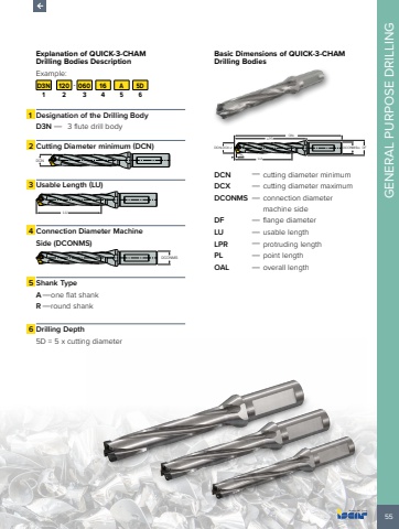 55GENERAL PURPOSE DRILLINGExplanation of QUICK-3-CHAM Drilling Bodies Description Example:D3N 120 - 060 16 A 5D1 2 3 4 5 61 Designation of the Drilling BodyD3N %u2014 3 flute drill body2 Cutting Diameter minimum (DCN) DCN3 Usable Length (LU) LU4 Connection Diameter Machine Side (DCONMS) DCONMS5 Shank TypeA%u2014one flat shankR %u2014round shank6 Drilling Depth5D = 5 x cutting diameterBasic Dimensions of QUICK-3-CHAM Drilling BodiesDCONMSh6 DFOALLPRPLDCN-DCX k7LUDCN %u2014 cutting diameter minimumDCX %u2014 cutting diameter maximumDCONMS %u2014 connection diameter machine sideDF %u2014 flange diameterLU %u2014 usable lengthLPR %u2014 protruding lengthPL %u2014 point lengthOAL %u2014 overall length