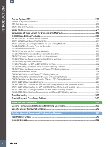 4 INTRODUCTIONISCAREjector System DTS.............................................................................................................................236Method of Ejector System DTS.....................................................................................................................................237DTS Drill Structure.............................................................................................................................................................238ISCAR DTS Drill Products............................................................................................................................................... 240Guide Pads .............................................................................................................................................241Calculation of Tube Length for BTA and DTS Methods...............................................................243ISCAR Deep Drilling Products...........................................................................................................244ISCAR-GUNDRILLS Solid Carbide Gundrills .............................................................................................................245ISCAR-GUNDRILLS Brazed Tip Gundrills....................................................................................................................251ISCAR-GUNDRILLS Cutting Conditions for Gun Drilling Methods.....................................................................257ISCAR-GUNDRILLS Inquiry Form for Gundrills........................................................................................................ 259TRI-DEEP Indexable Inserts...........................................................................................................................................260TRI-DEEP Solution for Gun Drilling Methods ........................................................................................................... 262TRI-DEEP Drill Diameter Adjustment Shims for Gundrills .................................................................................... 265TRI-DEEP Cutting Conditions for Gun Drilling Methods....................................................................................... 268TRI-DEEP Machine Requirements for Gun Drilling Methods .............................................................................. 269TRI-DEEP Inquiry Form for Gundrills............................................................................................................................270TRI-DEEP Solution for BTA and DTS Drilling Methods ..........................................................................................272TRI-DEEP Cutting Conditions for BTA and DTS Drilling Methods......................................................................274TRI-DEEP Machine Requirements for BTA and DTS Drilling Methods .............................................................276FINE-BEAM Indexable Inserts........................................................................................................................................278FINE-BEAM Solution for BTA and DTS Drilling Methods ..................................................................................... 280FINE-BEAM Cutting Conditions for BTA and DTS Drilling Methods..................................................................283FINE-BEAM Machine Requirements for BTA and DTS Drilling Methods ........................................................ 285ISCAR-DEEP-DRILL Indexable Inserts.........................................................................................................................287ISCAR-DEEP-DRILL Solution for BTA and DTS Drilling Methods with Indexable Inserts.............................291ISCAR-DEEP-DRILL Solution for BTA and DTS Drilling Methods with Brazed Tips..................................... 296ISCAR-DEEP-DRILL Cutting Conditions for BTA and DTS Drilling Methods .................................................. 299ISCAR-DEEP-DRILL Machine Requirements for BTA and DTS Drilling Methods ...........................................301Troubleshooting ...................................................................................................................................303Special Request Form Deep Drilling................................................................................................305Formulas and Definitions 307General Formulas and Definitions for Drilling Operations..........................................................308Specific Energy Consumption (SEC).................................................................................................313Cutting Material Grades and Engineering Materials 315Tool Material Grades ............................................................................................................................316Material Groups....................................................................................................................................320