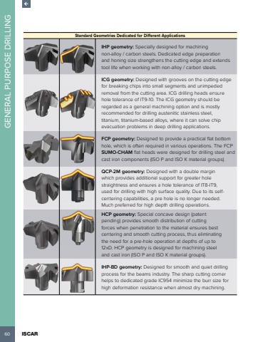 60 ISCAR GENERAL PURPOSE DRILLINGStandard Geometries Dedicated for Different ApplicationsIHP geometry: Specially designed for machining non-alloy / carbon steels. Dedicated edge preparation and honing size strengthens the cutting edge and extends tool life when working with non-alloy / carbon steels.ICG geometry: Designed with grooves on the cutting edge for breaking chips into small segments and unimpeded removal from the cutting area. ICG drilling heads ensure hole tolerance of IT9-10. The ICG geometry should be regarded as a general machining option and is mostly recommended for drilling austenitic stainless steel, titanium, titanium-based alloys, where it can solve chip evacuation problems in deep drilling applications.FCP geometry: Designed to provide a practical flat bottom hole, which is often required in various operations. The FCP SUMO-CHAM flat heads were designed for drilling steel and cast iron components (ISO P and ISO K material groups). QCP-2M geometry: Designed with a double margin which provides additional support for greater hole straightness and ensures a hole tolerance of IT8-IT9, used for drilling with high surface quality. Due to its selfcentering capabilities, a pre hole is no longer needed. Much preferred for high depth drilling operations.HCP geometry: Special concave design (patent pending) provides smooth distribution of cutting forces when penetration to the material ensures best centering and smooth cutting process, thus eliminating the need for a pre-hole operation at depths of up to 12xD. HCP geometry is designed for machining steel and cast iron (ISO P and ISO K material groups). IHP-BD geometry: Designed for smooth and quiet drilling process for the beams industry. The sharp cutting corner helps to dedicated grade IC954 minimize the burr size for high deformation resistance when almost dry machining.