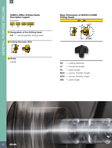 70GENERAL PURPOSE DRILLINGISCARSUMO-L-DRILL Drilling Heads Description Legend Example:ILP 120 - 2M IC9081 2 31 Designation of the Drilling HeadILP %u2014 exchangeable drilling head 2 Cutting Diameter (DC)DC3 GradeIC908Basic Dimensions of QUICK-3-CHAM Drilling HeadsICP %u2026-2MDCLF PLKCHBCHSIGDC %u2014 cutting diameterLF %u2014 functional lengthPL %u2014 point lengthBCH %u2014 corner chamfer lengthKCH %u2014 corner chamfer angleSIG %u2014 point angle