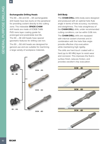82 ISCAR GENERAL PURPOSE DRILLINGExchangeable Drilling HeadsThe IDI %u2026-SG and IDI %u2026-SK exchangeable drill heads have two ducts on the peripheral for providing coolant directly to the cutting zone. The indexable SPADE-CHAMdrill heads are made of IC908 TiAlN PVD nano layer coating grade for prolonged and predictable tool life. The IDI %u2026-SK drill heads have special geometric features for drilling cast iron.The IDI %u2026-SG drill heads are designed for general use and are suitable for machining a large variety of workpiece materials. DCM %u2026-3DIDI %u2026-SKDCM %u2026-5DIDI %u2026-SGDCM %u2026-8DDrill BodyThe CHAM-DRILL drills body were designed and produced with an optimal helix flute angle in terms of hole accuracy, roundness, and straightness. The hole straightness of the CHAM-DRILL drills, under recommended cutting conditions, can be within 0.06 mm.The CHAM-DRILL drills are equipped with internal coolant channels and in combination with the helix flute angle provide effective chip evacuation while maintaining high rigidity.The drills are hard touch coated with a hard (up to 60 HRc) layer to resist wear and corrosion. This improves the flute%u2019s surface finish, reduces friction, and provides excellent chip evacuation. DCM %u2026-3DDCM %u2026-5DDCM %u2026-8D