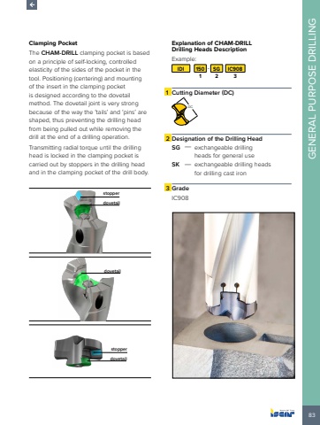 83GENERAL PURPOSE DRILLINGClamping PocketThe CHAM-DRILL clamping pocket is based on a principle of self-locking, controlled elasticity of the sides of the pocket in the tool. Positioning (centering) and mounting of the insert in the clamping pocket is designed according to the dovetail method. The dovetail joint is very strong because of the way the %u2018tails%u2019 and %u2018pins%u2019 are shaped, thus preventing the drilling head from being pulled out while removing the drill at the end of a drilling operation.Transmitting radial torque until the drilling head is locked in the clamping pocket is carried out by stoppers in the drilling head and in the clamping pocket of the drill body.stopperdovetaildovetailstopperdovetailExplanation of CHAM-DRILL Drilling Heads Description Example:IDI 150 - SG IC9081 2 31 Cutting Diameter (DC) DC2 Designation of the Drilling HeadSG %u2014 exchangeable drilling heads for general useSK %u2014 exchangeable drilling heads for drilling cast iron3 GradeIC908