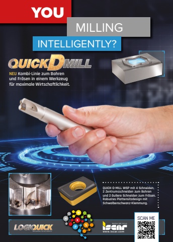 NEU Kombi-Linie zum Bohrenund Fr%u00e4sen in einem Werkzeugf%u00fcr maximale Wirtschaftlichkeit.www.isca r.comYOUMILLINGSCAN MEQUICK-D-MILL WSP mit 4 Schneiden,2 Zentrumsschneiden zum Bohrenund 2 %u00e4u%u00dfere Schneiden zum Fr%u00e4sen.Robustes Plattensitzdesign mitSchwalbenschwanz-Klemmung.INTELLIGENTLY?