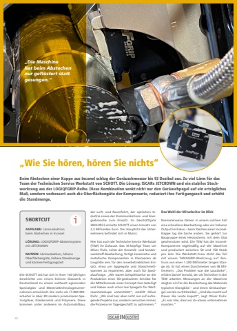 %u201eDie Maschine hat beim Abstechen nur gefl%u00fcstert statt gesungen.%u201c %u201eWie Sie h%u00f6ren, h%u00f6ren Sie nichts%u201cBeim Abstechen einer Kappe aus Inconel schlug der Ger%u00e4uschmesser bis 93 Dezibel aus. Zu viel L%u00e4rm f%u00fcr das Team der Technischen Service Werkstatt von SCHOTT. Die L%u00f6sung: ISCARs JETCROWN und ein stabiles Stech,werkzeug aus der LOGIQFGRIP-Reihe. Diese Kombination senkt nicht nur den Ger%u00e4uschpegel auf ein ertr%u00e4gliches Ma%u00df, sondern verbessert auch die Oberfl%u00e4cheng%u00fcte der Komponente, reduziert ihre Fertigungszeit und erh%u00f6ht die Standmenge.Die SCHOTT AG hat sich in ihrer 140-j%u00e4hrigen Geschichte von einem kleinen Glaswerk in Deutschland zu einem weltweit agierenden Spezialglas- und Materialtechnologieunternehmen entwickelt. Die mehr als 17.000 Mitarbeiter in %u00fcber 30 L%u00e4ndern produzieren Spezialgl%u00e4ser, Glaskeramik und Polymere. Diese kommen unter anderem im Automobilbau, der Luft- und Raumfahrt, der optischen Industrie sowie der Kommunikations- und Energiebranche zum Einsatz. Im Gesch%u00e4ftsjahr 2022/2023 erzielte SCHOTT einen Umsatz von 2,3 Milliarden Euro. Der Hauptsitz des Unternehmens befindet sich in Mainz. Hier hat auch die Technische Service Werkstatt (TSW) ihr Zuhause. Das 16-k%u00f6pfige Team um Oliver Fluhr, Leiter der Keramik- und Sonderwerkstoff-Bearbeitung, fertigt keramische und metallische Komponenten in Kleinserien ab Losgr%u00f6%u00dfe eins f%u00fcr den innerbetrieblichen Einsatz, etwa um Aggregate und Glasschmelzwannen zu reparieren, aber auch f%u00fcr Spezialauftr%u00e4ge. %u201eWir waren beispielsweise an der Produktion einer 3D-gedruckten Scheibe f%u00fcr die Mittelkonsole eines Concept-Cars beteiligt und haben auch schon bei Spiegeln f%u00fcr Weltraumteleskope unterst%u00fctzt%u201c, erz%u00e4hlt Oliver Fluhr. %u201eWir sind hier aber nicht nur auf aufregende Projekte aus, sondern versuchen immer, die Prozesse im Tagesgesch%u00e4ft zu optimieren.%u201cDas Wohl der Mitarbeiter im BlickNormalerweise stehen in einem solchen Fall eine schnellere Bearbeitung oder ein h%u00f6herer Output im Fokus %u2013 beim Stechen einer InconelKappe lag die Sache anders. Sie geh%u00f6rt zur Baugruppe eines Heizsystems, mit dem Glas geschmolzen wird. Die TSW hat die InconelKomponente regelm%u00e4%u00dfig auf der Maschine und produziert zwischen 50 und 150 St%u00fcck pro Jahr. Die Werkstatt-Crew sticht das Teil mit einem TANGGRIP-Werkzeug auf Zentrum von einer 1.200-Millimeter langen Stange ab. Es hat einen Durchmesser von 48 Millimetern. %u201eDas Problem war die Laust%u00e4rke%u201c, erkl%u00e4rt Daniel Arnold, der als Techniker in der TSW arbeitet. Messungen an der Maschine zeigten ein f%u00fcr die Bearbeitung des Materials typisches Klangbild %u2013 und einen Ger%u00e4uschpegel von bis zu 93 Dezibel. %u201eUnd das macht auf Dauer die Leute kaputt%u201c, sagt Oliver Fluhr.%u201eEs war klar, dass wir da etwas unternehmen mussten.%u201c SHORTCUTAUFGABE: L%u00e4rmreduktion beim Abstechen in InconelL%u00d6SUNG: LOGIQFGRIP-Abstechsystem mit JETCROWNNUTZEN: L%u00e4rmreduktion, h%u00f6here Oberfl%u00e4cheng%u00fcte, h%u00f6here Standmenge und k%u00fcrzere Fertigungszeit i40