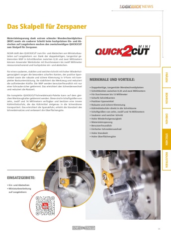 FR%u00c4SEN BOHREN DREHEN STECHEN INDUSTRIENNEWSDas Skalpell f%u00fcr ZerspanerEINSATZGEBIETE:%u2022 Ein- und Abstechen %u2022 Miniaturbearbeitung auf LangdrehernMaterialeinsparung dank extrem schmaler Wendeschneidplatten (WSP) sowie ein sauberer Schnitt beim hochpr%u00e4zisen Ein- und Abstechen auf Langdrehern machen den zweischneidigen QUICK2CUT zum Skalpell f%u00fcr Zerspaner.ISCAR stellt den QUICK2CUT zum Ein- und Abstechen von Miniaturbauteilen auf Langdrehern vor. Dank der doppelseitigen, tangential geklemmten WSP in Schnittbreiten zwischen 0,33 und zwei Millimetern k%u00f6nnen Anwender Werkst%u00fccke mit Durchmessern bis zw%u00f6lf Millimeter ressourcenschonend und hochpr%u00e4zise ein- und abstechen.F%u00fcr einen sauberen, stabilen und weichen Schnitt mit hoher Wiederholgenauigkeit sorgen die besonders scharfen Kanten, der positive Spanwinkel sowie die robuste und sichere Klemmung in V-Form mit kompletter Basisunterst%u00fctzung. Sie stabilisiert das Werkzeug und reduziert die auftretenden Kr%u00e4fte. Die WSP werden benutzerfreundlich mit nur einer Schraube sicher geklemmt. Das erleichtert den Schneidenwechsel und reduziert die R%u00fcstzeit.Die komplette QUICK2CUT-Schneideinsatz-Palette kann auf dem gleichen Werkzeughalter geklemmt werden. Diese sind in Schaftgr%u00f6%u00dfen von zehn, zw%u00f6lf und 16 Millimetern verf%u00fcgbar und besitzen eine innere K%u00fchlmittelzufuhr, die das K%u00fchlmittel zielgenau in die Schneidzone transportiert. Das erleichtert die Spanabfuhr, erh%u00f6ht die Standzeit des Schneideinsatzes und verbessert die Oberfl%u00e4cheng%u00fcte.MERKMALE UND VORTEILE:%u2022 Doppelseitige, tangentiale Wendeschneidplatten%u2022 Schnittbreiten zwischen 0,33 und zwei Millimetern%u2022 F%u00fcr Durchmesser bis 12 Millimeter%u2022 Scharfe Schnittkanten%u2022 Positiver Spanwinkel%u2022 Robuste und sichere Klemmung%u2022 K%u00fchlmittelzufuhr direkt in die Schnittzone%u2022 Schaftgr%u00f6%u00dfen von zehn, zw%u00f6lf und 16 Millimetern%u2022 Sauberer und weicher Schnitt%u2022 Hohe Wiederholgenauigkeit%u2022 Materialeinsparung%u2022 Benutzerfreundlich%u2022 Einfacher Schneidenwechsel%u2022 Hohe Standzeit%u2022 Hohe Oberfl%u00e4cheng%u00fcte45