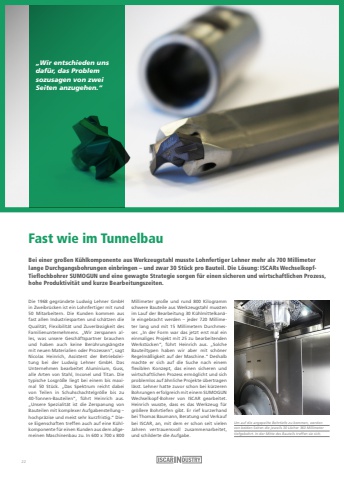 Fast wie im TunnelbauDie 1968 gegr%u00fcndete Ludwig Lehner GmbH in Zweibr%u00fccken ist ein Lohnfertiger mit rund 50 Mitarbeitern. Die Kunden kommen aus fast allen Industriesparten und sch%u00e4tzen die Qualit%u00e4t, Flexibilit%u00e4t und Zuverl%u00e4ssigkeit des Familienunternehmens. %u201eWir zerspanen alles, was unsere Gesch%u00e4ftspartner brauchen und haben auch keine Ber%u00fchrungs%u00e4ngste mit neuen Materialien oder Prozessen%u201c, sagt Nicolas Heinrich, Assistent der Betriebsleitung bei der Ludwig Lehner GmbH. Das Unternehmen bearbeitet Aluminium, Guss, alle Arten von Stahl, Inconel und Titan. Die typische Losgr%u00f6%u00dfe liegt bei einem bis maximal 50 St%u00fcck. %u201eDas Spektrum reicht dabei von Teilen in Schuhschachtelgr%u00f6%u00dfe bis zu 40-Tonnen-Bauteilen%u201c, f%u00fchrt Heinrich aus.%u201eUnsere Spezialit%u00e4t ist die Zerspanung von Bauteilen mit komplexer Aufgabenstellung %u2013 hochpr%u00e4zise und meist sehr kurzfristig.%u201c Diese Eigenschaften treffen auch auf eine K%u00fchlkomponente f%u00fcr einen Kunden aus dem allgemeinen Maschinenbau zu. In 600 x 700 x 800 Millimeter gro%u00dfe und rund 800 Kilogramm schwere Bauteile aus Werkzeugstahl mussten im Lauf der Bearbeitung 30 K%u00fchlmittelkan%u00e4le eingebracht werden %u2013 jeder 720 Millimeter lang und mit 15 Millimetern Durchmesser. %u201eIn der Form war das jetzt erst mal ein einmaliges Projekt mit 25 zu bearbeitenden Werkst%u00fccken%u201c, f%u00fchrt Heinrich aus. %u201eSolche Bauteiltypen haben wir aber mit sch%u00f6ner Regelm%u00e4%u00dfigkeit auf der Maschine.%u201c Deshalb machte er sich auf die Suche nach einem flexiblen Konzept, das einen sicheren und wirtschaftlichen Prozess erm%u00f6glicht und sich problemlos auf %u00e4hnliche Projekte %u00fcbertragen l%u00e4sst. Lehner hatte zuvor schon bei k%u00fcrzeren Bohrungen erfolgreich mit einem SUMOGUN Wechselkopf-Bohrer von ISCAR gearbeitet.Heinrich wusste, dass es das Werkzeug f%u00fcr gr%u00f6%u00dfere Bohrtiefen gibt. Er rief kurzerhand bei Thomas Baumann, Beratung und Verkauf bei ISCAR, an, mit dem er schon seit vielen Jahren vertrauensvoll zusammenarbeitet, und schilderte die Aufgabe.Bei einer gro%u00dfen K%u00fchlkomponente aus Werkzeugstahl musste Lohnfertiger Lehner mehr als 700 Millimeter lange Durchgangsbohrungen einbringen %u2013 und zwar 30 St%u00fcck pro Bauteil. Die L%u00f6sung: ISCARs WechselkopfTieflochbohrer SUMOGUN und eine gewagte Strategie sorgen f%u00fcr einen sicheren und wirtschaftlichen Prozess,hohe Produktivit%u00e4t und kurze Bearbeitungszeiten.Um auf die angepeilte Bohrtiefe zu kommen, werden von beiden Seiten die jeweils 30 L%u00f6cher 360 Millimeter tiefgebohrt. In der Mitte des Bauteils treffen sie sich.%u201eWir entschieden uns daf%u00fcr, das Problem sozusagen von zwei Seiten anzugehen.%u201c22