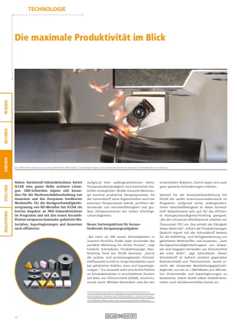 TECHNOLOGIEFR%u00c4SEN BOHREN DREHEN STECHEN INDUSTRIENDie maximale Produktivit%u00e4t im BlickZur effizienten Zerspanung von geh%u00e4rteten Materialien, Superlegierungen und Gusseisen kommen Keramik-Schneidstoffe zum Einsatz. Neben Hartmetall-Schneideins%u00e4tzen bietet ISCAR eine ganze Reihe weiterer L%u00f6sungen. CBN-Schneiden eignen sich besonders f%u00fcr die Hochvorschubbearbeitung von Gusseisen und das Zerspanen hochharter Werkstoffe. F%u00fcr die Hochgeschwindigkeitszerspanung von NE-Metallen hat ISCAR ein breites Angebot an PKD-Schneideins%u00e4tzen im Programm und mit den neuen KeramikPlatten zerspanen Anwender geh%u00e4rtete Materialien, Superlegierungen und Gusseisen noch effizienter.Aufgrund ihrer au%u00dfergew%u00f6hnlichen H%u00e4rte, Temperaturbest%u00e4ndigkeit und chemischen Stabilit%u00e4t erm%u00f6glichen ISCARs Keramik-Werkzeuge maximal produktive Zerspanprozesse. Da der Schneidstoff seine Eigenschaften auch bei extremen Temperaturen beh%u00e4lt, profitiert der Anwender von Verschlei%u00dffestigkeit und gro%u00dfem Zeitspanvolumen bei hohen Schnittgeschwindigkeiten.Neues Sortenspektrum f%u00fcr herausfordernde Zerspanungsaufgaben%u201eBei mehr als 300 neuen Schneidplatten in unserem Portfolio findet jeder Anwender das perfekte Werkzeug f%u00fcr seinen Prozess%u201c, sagt Frederik Schmalbach, Produktmanager NonRotating Tools bei ISCAR Germany. %u201eDurch die pr%u00e4zise und prozessangepasste Schneidstoffauswahl erzielt er lange Standzeiten auch bei geh%u00e4rteten St%u00e4hlen, Guss und Superlegierungen.%u201c Zur Auswahl steht eine breite Palette an Schneideins%u00e4tzen in verschiedenen Formen auf Basis von Siliziumnitrid (Si3N4), Aluminiumoxid sowie Whisker-Keramiken und die neu entwickelten Bidemics. Damit lassen sich auch ganz spezielle Anforderungen erf%u00fcllen.Speziell f%u00fcr die Gusseisenbearbeitung hat ISCAR die wei%u00dfe Aluminiumoxidkeramik im Programm. Aufgrund seiner au%u00dfergew%u00f6hnlichen Verschlei%u00dffestigkeit ist dieser Schneidstoff beispielsweise sehr gut f%u00fcr das effiziente Hochgeschwindigkeits-Finishing geeignet.%u201eBei der schwarzen Mischkeramik arbeiten wir Titancarbid (TiC) ein. Das erh%u00f6ht die Z%u00e4higkeit dieses Materials%u201c, erkl%u00e4rt der Produktmanager.Dadurch eignet sich der Schneidstoff bestens f%u00fcr die Halbfertig- und Fertigbearbeitung von geh%u00e4rteten Werkstoffen und Gusseisen. %u201eZum Hochgeschwindigkeitsschruppen von Gusseisen sind dagegen Schneiden aus Siliziumnitrid die erste Wahl%u201c, sagt Schmalbach. Dieser Schneidstoff ist %u00e4u%u00dferst resistent gegen%u00fcber Kerbverschlei%u00df und Thermoschock. Damit erreicht der Anwender Bearbeitungsgeschwindigkeiten von bis zu 1.000 Metern pro Minute.Um Sintermetalle und Superlegierungen zu bearbeiten, bietet ISCAR neben SiAlON-Keramiken auch whiskerverst%u00e4rkte Sorten an.ISCAR bietet eine breite Palette an Schneideins%u00e4tzen in verschiedenen Formen auf Siliziumnitrid-, Aluminiumoxidund Whisker-Basis sowie die neu entwickelten Bidemics.32