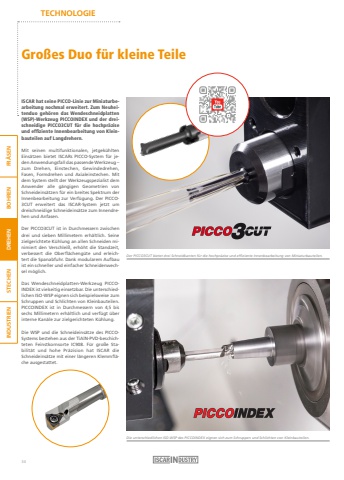 TECHNOLOGIEFR%u00c4SEN BOHREN DREHEN STECHEN INDUSTRIENGro%u00dfes Duo f%u00fcr kleine TeileDer PICCO3CUT bietet drei Schneidkanten f%u00fcr die hochpr%u00e4zise und effiziente Innenbearbeitung von Miniaturbauteilen.ISCAR hat seine PICCO-Linie zur Miniaturbearbeitung nochmal erweitert. Zum Neuheitenduo geh%u00f6ren das Wendeschneidplatten (WSP)-Werkzeug PICCOINDEX und der dreischneidige PICCO3CUT f%u00fcr die hochpr%u00e4zise und effiziente Innenbearbeitung von Kleinbauteilen auf Langdrehern.Mit seinen multifunktionalen, jetgek%u00fchlten Eins%u00e4tzen bietet ISCARs PICCO-System f%u00fcr jeden Anwendungsfall das passende Werkzeug %u2013 zum Drehen, Einstechen, Gewindedrehen, Fasen, Formdrehen und Axialeinstechen. Mit dem System stellt der Werkzeugspezialist dem Anwender alle g%u00e4ngigen Geometrien von Schneideins%u00e4tzen f%u00fcr ein breites Spektrum der Innenbearbeitung zur Verf%u00fcgung. Der PICCO3CUT erweitert das ISCAR-System jetzt um dreischneidige Schneideins%u00e4tze zum Innendrehen und Anfasen.Der PICCO3CUT ist in Durchmessern zwischen drei und sieben Millimetern erh%u00e4ltlich. Seine zielgerichtete K%u00fchlung an allen Schneiden minimiert den Verschlei%u00df, erh%u00f6ht die Standzeit, verbessert die Oberfl%u00e4cheng%u00fcte und erleichtert die Spanabfuhr. Dank modularem Aufbau ist ein schneller und einfacher Schneidenwechsel m%u00f6glich.Das Wendeschneidplatten-Werkzeug PICCOINDEX ist vielseitig einsetzbar. Die unterschiedlichen ISO-WSP eignen sich beispielsweise zum Schruppen und Schlichten von Kleinbauteilen.PICCOINDEX ist in Durchmessern von 4,5 bis sechs Millimetern erh%u00e4ltlich und verf%u00fcgt %u00fcber interne Kan%u00e4le zur zielgerichteten K%u00fchlung.Die WSP und die Schneideins%u00e4tze des PICCOSystems bestehen aus der TiAlN-PVD-beschichteten Feinstkornsorte IC908. F%u00fcr gro%u00dfe Stabilit%u00e4t und hohe Pr%u00e4zision hat ISCAR die Schneideins%u00e4tze mit einer l%u00e4ngeren Klemmfl%u00e4che ausgestattet.Die unterschiedlichen ISO-WSP des PICCOINDEX eignen sich zum Schruppen und Schlichten von Kleinbauteilen. 34